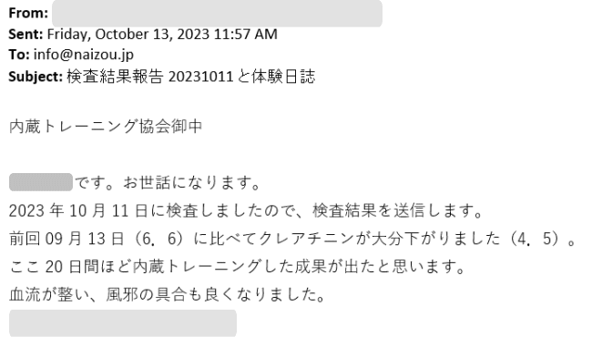 2023年10月11日に検査しましたので、検査結果を送信します。前回09月13日(6.6)に比べてクレアチニンが大分下がりました(4.5)。ここ20日間ほど内蔵トレーニングした成果が出たと思います。血流が整い、風邪の具合も良くなりました。