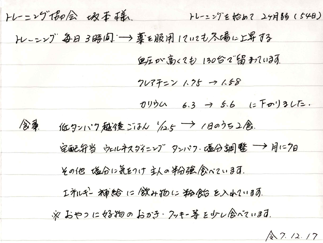 トレーニング毎日3時間→薬を服用していても冬場に上昇する血圧が高くても130台で留まっています。クレアチニン 1.75→1.58 カリウム6.3→5.6に下がりました。