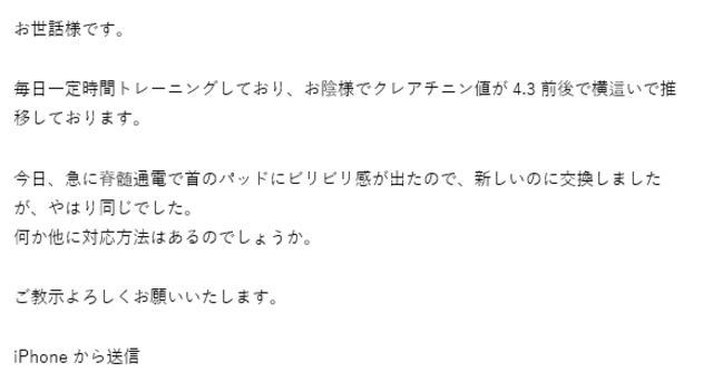 毎日一定時間トレーニングしており、お陰様でクレアチニン値が4.3前後で横這いで推移しております。 お世話様です。 毎日一定時間トレーニングしており、お陰様でクレアチニン値が4.3前後で横這いで推移しております。 今日、急に脊髄通電で首のパッドにビリビリ感が出たので、新しいのに交換しましたが、やはり同じでした。 何か他に対応方法はあるのでしょうか。 ご教示よろしくお願いいたします。 2022.11.21 腎臓病患者さんよりメール