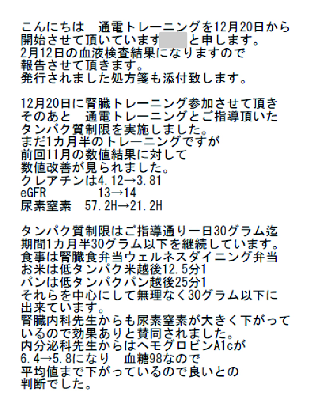食事は腎臓食弁当ウェルネスダイニング弁当お米は低タンパク米越後12.5分1パンは低タンパクパン越後25分1それらを中心にして無理なく30グラム以下に出来ています。腎臓内科先生からも尿素窒素が大きく下がっているので効果ありと賛同されました。内分泌科先生からはヘモグロビンA1cが6.4→5.8になり 血糖98なので平均値まで下がっているので良いとの判断でした。