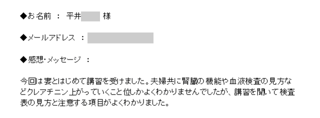 夫婦共に腎臓の機能や血液検査の見方などクレアチニン上がっていくこと位しかよくわかりませんでしたが、講習を聞いて検査表の見方と注意する項目がよくわかりました。