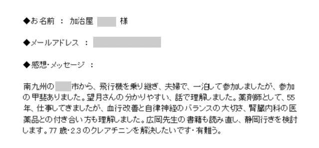 今回セミナーを開催していただき、望月先生の大変詳しい具体的な説明を受けまして、希望が湧いてきた次第です。