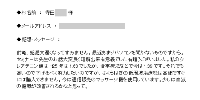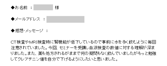 ちなみに、直近のeGFRは46位です。腎機能は回復しないという情報を聞いておりましたので、貴トレーニング協会のことを知り、セミナーに参加させていただきました。