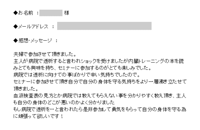 主人が病院で透析すると言われショックを受けましたが内臓トレーニングの本を読みとても興味を持ち、セミナーに参加するのがとても楽しみでした。