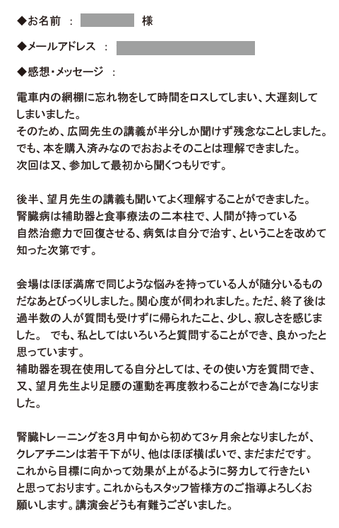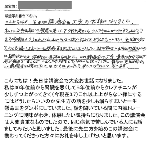26年6月2日 内臓トレーニング協会様 廣岡 孝 先生 望月 みや子 先生 坂本 浩美 先生 まだ6月になったばかりなのに、猛暑日が続いております。 これから梅雨期になるというのに、一体どうしたことでしょうか。 6月に入っても猛暑日がつづいていますが、水分補給を心掛けたいと思っています。 スギ、ヒノキの花粉症の時期が過ぎましたのに、私も含めて外来患者さんにも、相変わらずアレルギー性鼻炎の患者が絶えません。 私も抗アレルギー剤から完全には離脱しきれてはいませんが、一時よりは大分減量してきました。 そのせいか肝機能は全て正常値に戻りました。 猛暑日の続く折から、皆様のご健康と、今後のご発展をお祈り致しております。 敬具 ○○