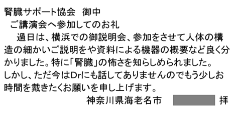 過日は、横浜での御説明会、参加をさせて人体の構造の細かいご説明をや資料による機器の概要など良く分かりました。特に「腎臓」の怖さを知らしめられました。ただ今はDrにも話してありませんのでもう少しお時間を戴きたくお願いを申し上げます。