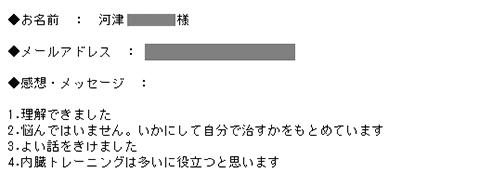 講演会の内容や理解でき、内臓トレーニングは役立つと思いました。 1.理解できました 2.悩んではいません。いかにして自分で治すかをもとめています 3.よい話をきけました 4.内臓トレーニングは多いに役立つと思います 2015年7月 「名古屋」講演会 参加者からの声