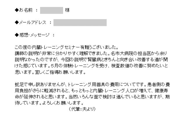 主治医から腎臓の機能低下は治らないと言われ、日常生活の改善で現状維持しかないとネガティヴに思っていましたが、今回の講習を受け、そうではないことが頭で理解できましたので、今後は積極的に行動に移し、結果を出してみたいとポジティブに思っています。