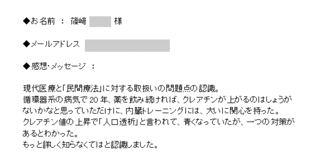 循環器系の病気で20年、薬を飲み続ければ、クレアチンが上がるのはしょうがないかなと思っていただけに、内臓トレーニングには、大いに関心を持った。