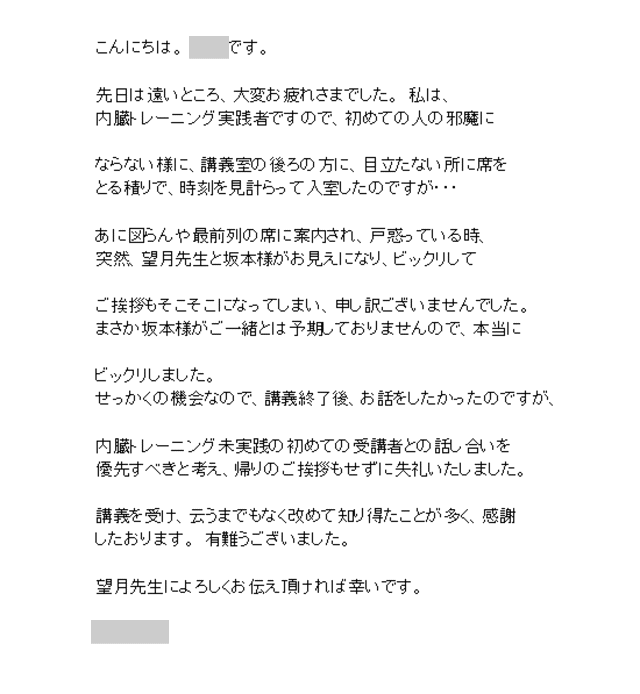 せっかくの機会なので、講義終了後、お話をしたかったのですが、内臓トレーニング未実践の初めての受講者との話し合いを優先すべきと考え、帰りのご挨拶もせずに失礼いたしました。