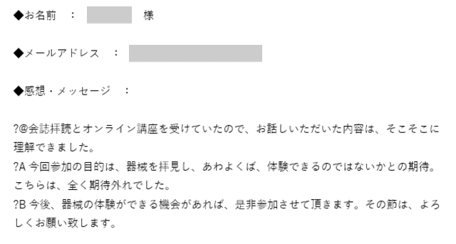 ?B今後、器械の体験ができる機会があれば、是非参加させて頂きます。その節は、よろしくお願い致します。