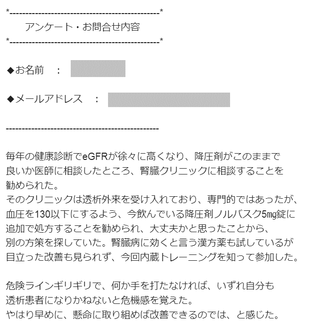 腎臓病に効くと言う漢方薬も試しているが目立った改善も見られず、今回内蔵トレーニングを知って参加した。