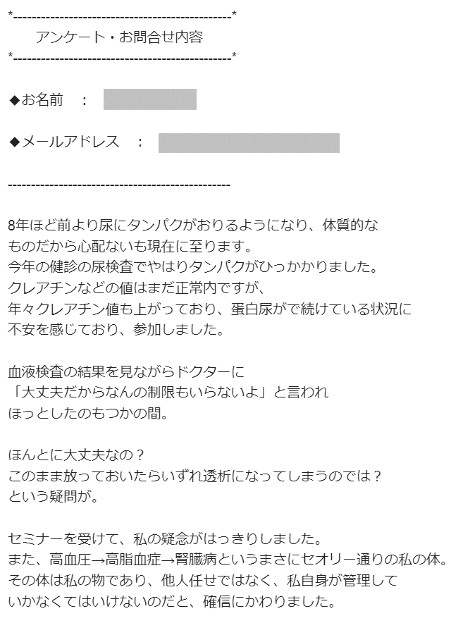 クレアチンなどの値はまだ正常内ですが、年々クレアチン値も上がっており、蛋白尿がで続けている状況に不安を感じており、参加しました。