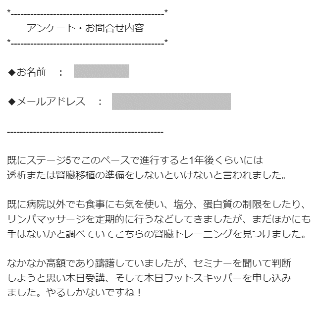 なかなか高額であり躊躇していましたが、セミナーを聞いて判断しようと思い本日受講、そして本日フットスキッパーを申し込みました。
