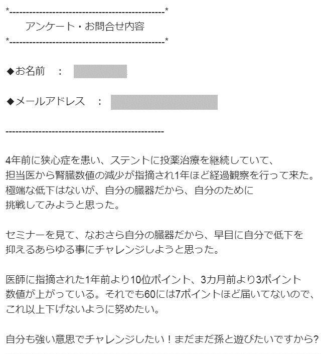 セミナーを見て、なおさら自分の臓器だから、早目に自分で低下を抑えるあらゆる事にチャレンジしようと思った。