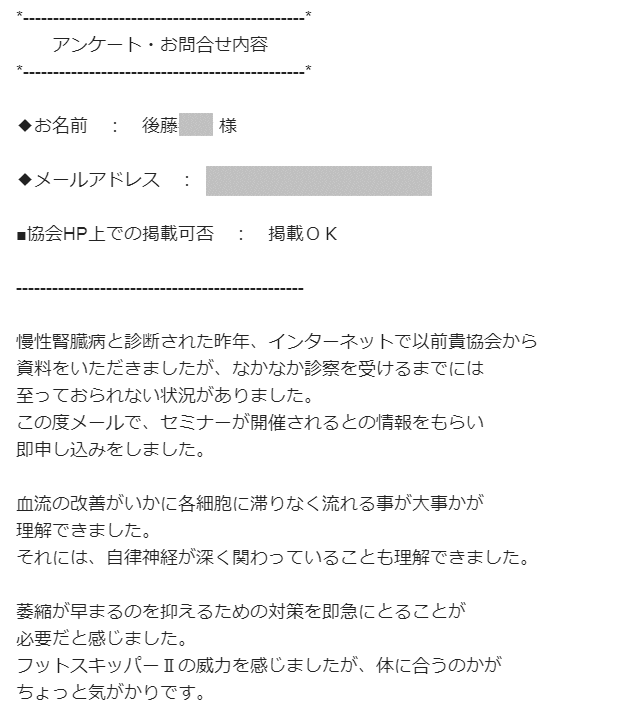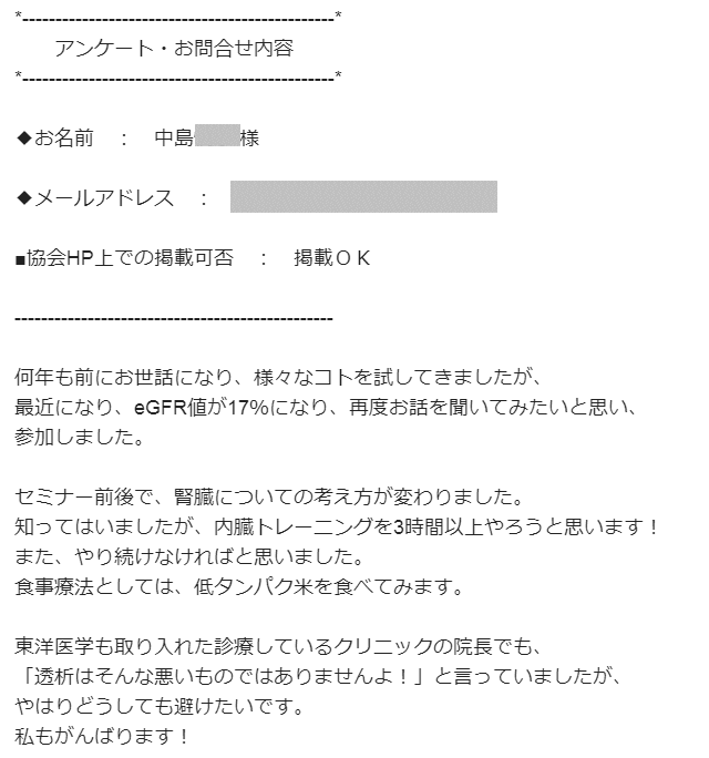 何年も前にお世話になり、様々なコトを試してきましたが、最近になり、eGFR値が、17%になり再度お話を聞いてみたいと思い、参加しました。