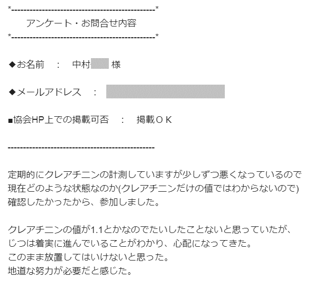 定期的にクレアチニンの計測していますが少しずつ悪くなっているので現在どのような状態なのか(クレアチニンだけの値ではわからないので)確認したかったから、参加しました。