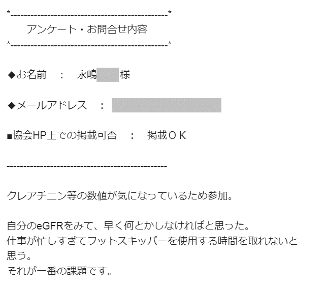 自分のクレアチニンの値が0.91で慢性腎臓病の疑いがあると主治医に言われたため参加。