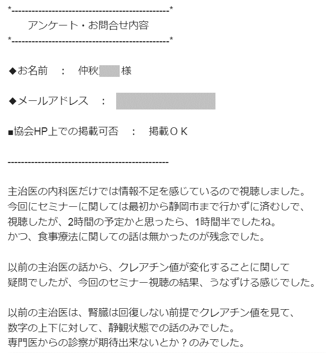 セミナーを聞いて、今の医学では、腎臓病は治せないと思いました。