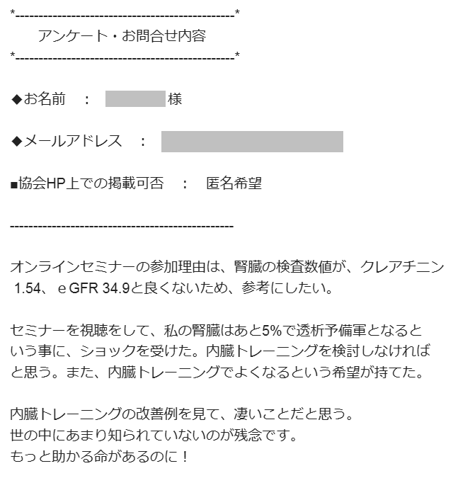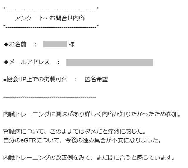 オンラインセミナーの参加理由は、腎臓の検査数値が、クレアチニン 1.54、eGFR 34.9と良くないため、参考にしたい。