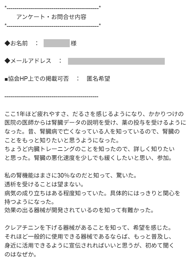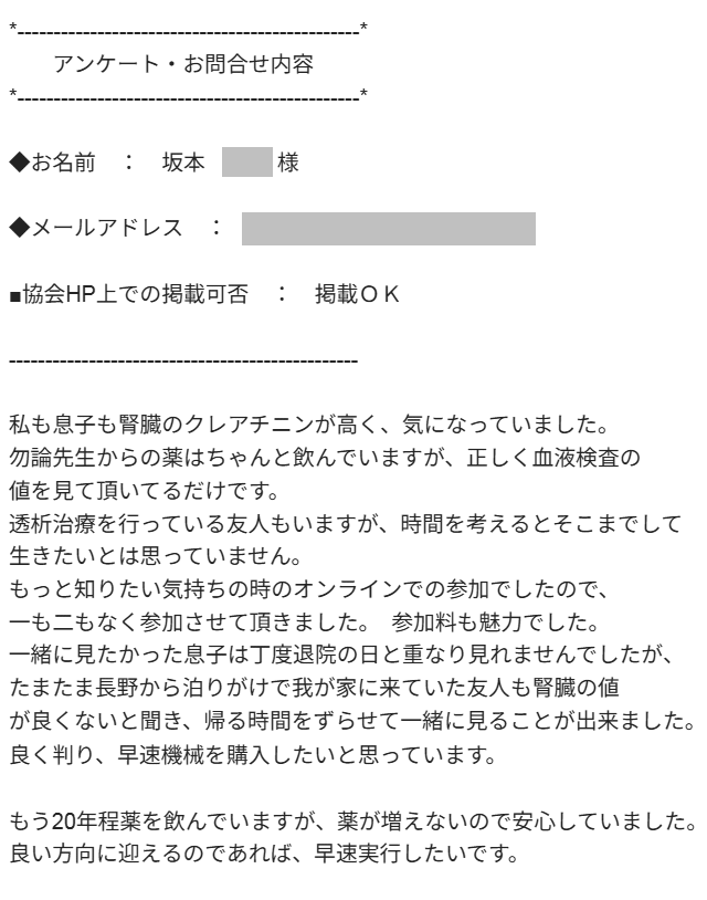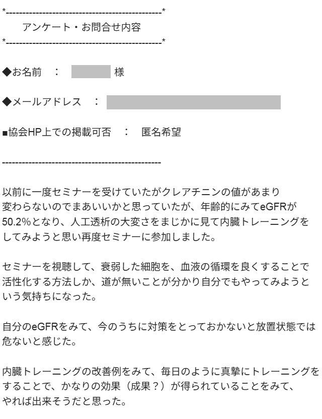 セミナーを視聴して、内臓トレーニングと食事療法でクレアチニンが4日間で2.45から1.24へ50%も改善された人がいるとは驚きました。