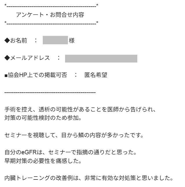 以前に一度セミナーを受けていたがクレアチニンの値があまり変わらないのでまあいいかと思っていたが、年齢的にみてeGFRが50.2%となり、人工透析の大変さをまじかに見て内臓トレーニングをしてみようと思い再度セミナーに参加しました。