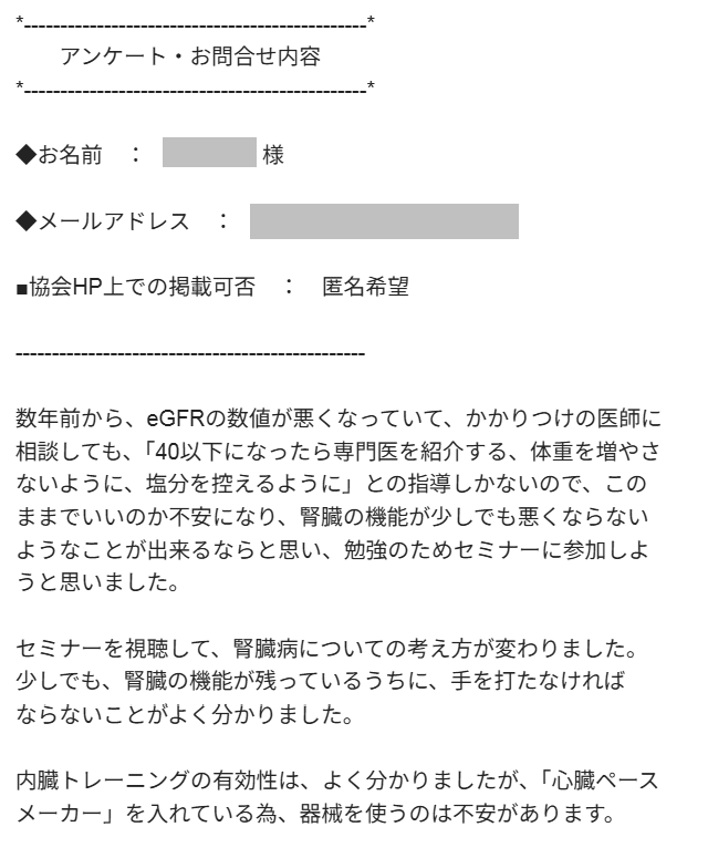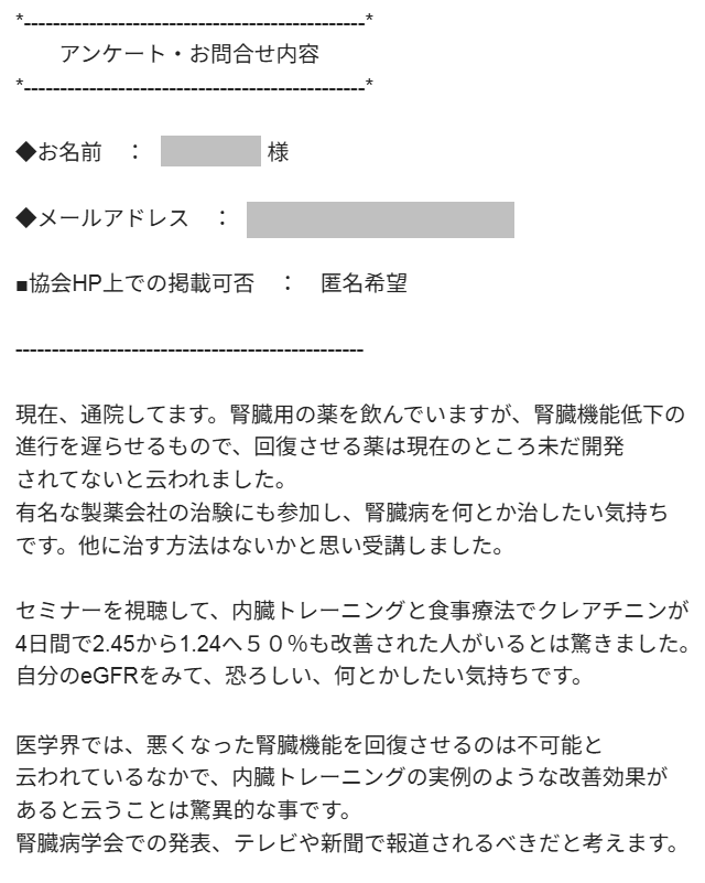 セミナーを視聴して、内臓トレーニングと食事療法でクレアチニンが4日間で2.45から1.24へ50%も改善された人がいるとは驚きました。