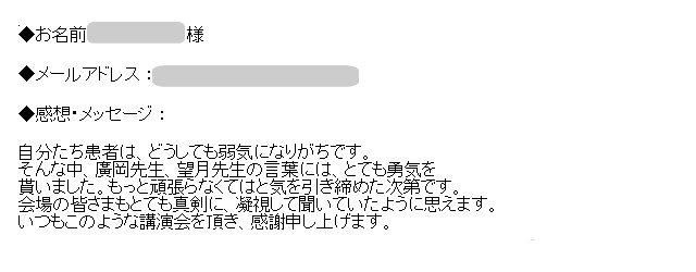 講演会に参加する前は、まさか自分がこんなふうになると思っていなかったので、気持ちが後ろ向きでしたが、ネットでこの講演会を知った時に参加すれば、得る物がたくさんあるのではないかと参加を決意しました。