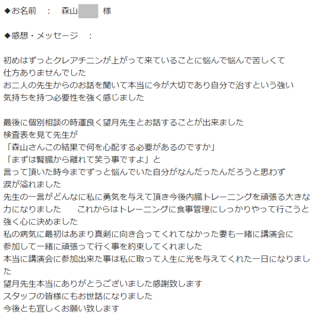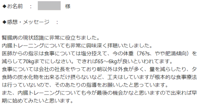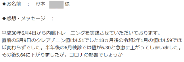 先生の一言がどんなに私に勇気を与えて頂き今後内臓トレーニングを頑張る大きな力になりました