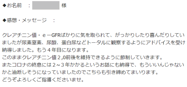 もう4年目になります。このままクレアチニン値2,0前後を維持できるように節制していきます。