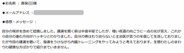 自分の病はもう治らないと主治医が言うのを信じて生活しておりましたが今回の講演を聴いて、指導をうけながら内臓トレーニングをやってみようと考えております。