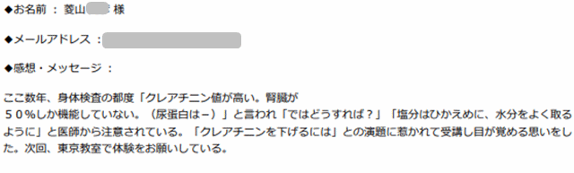 「クレアチニンを下げるには」との演題に惹かれて受講し目が覚める思いをした。次回、東京教室で体験をお願いしている。