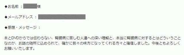 本とDVDからでは伝わらない、腎臓病に苦しむ人達への深い理解と、本当に腎臓病に対するとはどういうことなのか、お話の随所に込められて、確かに我々の味方になってくれる方々と確信しました。