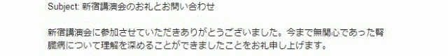 今まで無関心であった腎臓病について理解を深めることができましたことをお礼申し上げます。