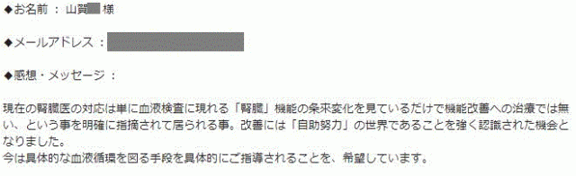 現在の腎臓医の対応は単に血液検査に現れる「腎臓」機能の条來変化を見ているだけで機能改善への治療では無い、という事を明確に指摘されて居られる事。