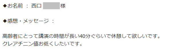 高齢者にとって講演の時間が長い40分ぐらいで休憩して欲しいです。