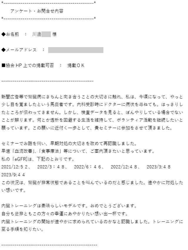 自分のeGFRは50パーセントきっているので深刻になったが、内臓トレーニングで改善されている例を見て、生きる希望がわくしずっと考えなくなるので前向きに生きられると思えた。