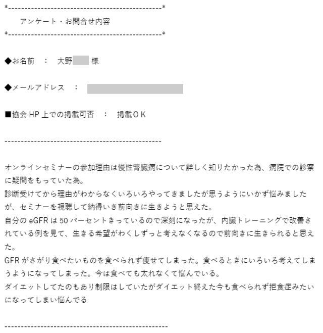 セミナーを聞いて腎臓病は治らない病気だと知り、これ以上悪化させない努力が必要と思いました。