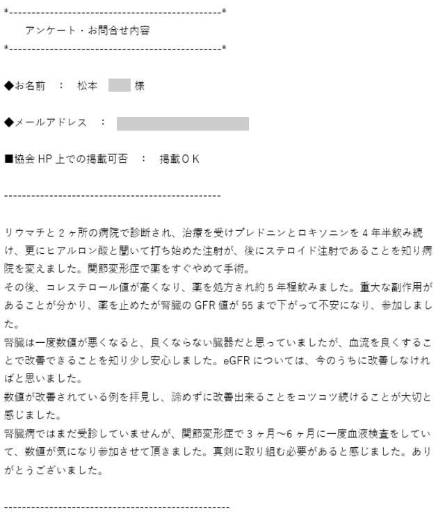 重大な副作用があることが分かり、薬を止めたが腎臓のGFR値が55まで下がって不安になり、参加しました。