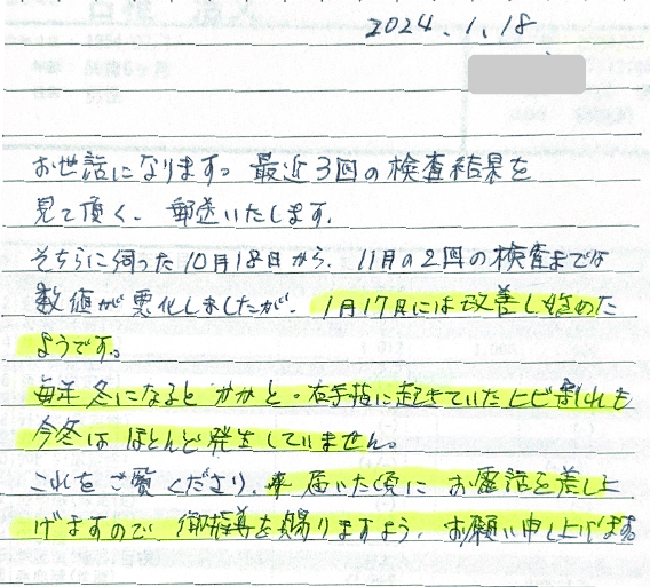 最近3回の検査結果を見ていただきたく、郵送いたします。そちらに伺った10月18日から11月の2回の検査までは数値が悪化しましたが、1月17日には改善しはじめたようです。
