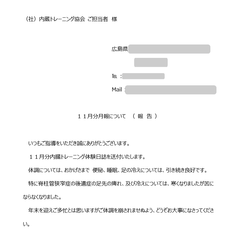 11月分体験日誌を送付いたします。体調については、おかげさまで 便秘、睡眠、足の冷えについては引き続き良好です。特に、脊柱管狭窄症の後遺症の足先の痺れ、および冷えについては、寒くなりましたが苦にならなくなりました。年末を迎えご多忙とは思いますがご体調を崩されませぬよう、どうぞお大事になさってください。
