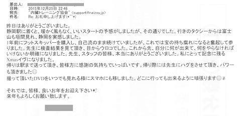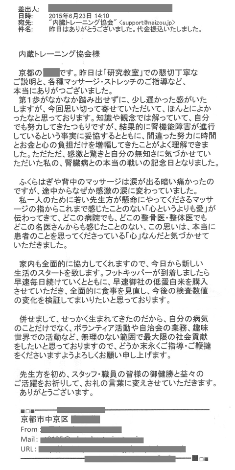 かえすがえすも、もう少し早くに気がつけばという思いもありますが、今の時点で内臓トレーニングに出会えた私は幸せかなと思います。