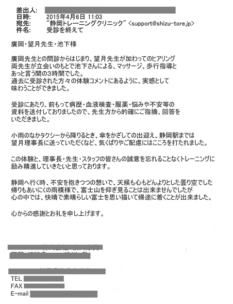 先日はお世話になりました。詳しい検査結果データの解説、病状についての詳細な説明、合理的なトレーニングのなど、遅ればせながら自分の置かれている状況を正しく認識することができあました。