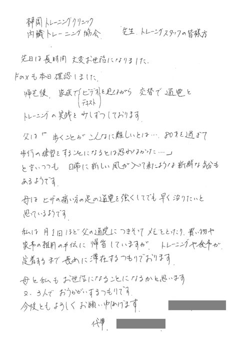 帰宅後、家族でビデオ、テキストを見ながら交替で通電とトレーニングの実践を少しずつしております。