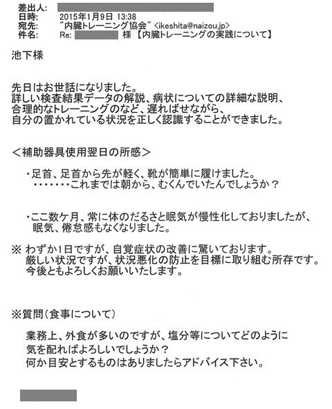 先日はお世話になりました。詳しい検査結果データの解説、病状についての詳細な説明、合理的なトレーニングのなど、遅ればせながら自分の置かれている状況を正しく認識することができあました。