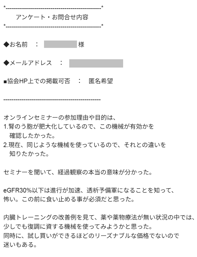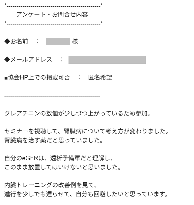 中々クレアチニンの数値がよくならず、eGFRも少しずつですが悪くなり気なっていた時に御協会のセミナーを知り参加させて頂きました。