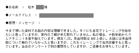講演会を聞きクレアチニンの重要性を認識し、一度「内臓トレーニング」を体験したくなり、申し込みをしました。