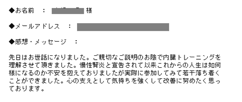 腎臓の病気は治らないと言われていたので気持ちが沈んでいましたが、前向きに頑張る気持ちになりました。