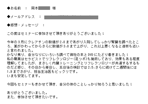 担当医師からは2,3年後には透析治療と宣告されましたが、この講演会の内容に希望が出てきました。