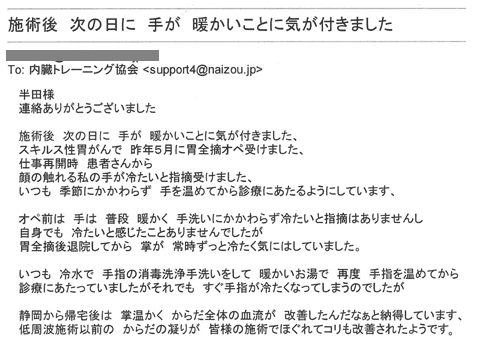 施術後 次の日に手が暖かいことに気が付きました。
